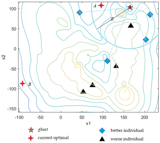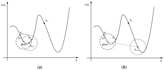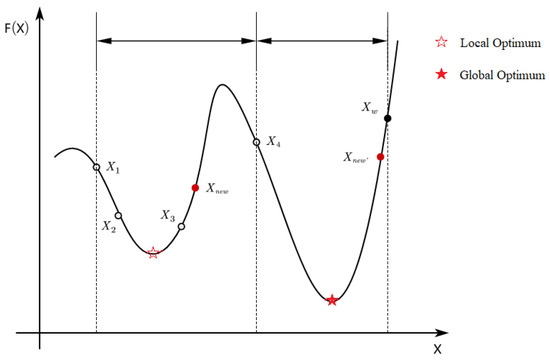 The effectiveness of BSO in solving optimization problems depends on the idea updating strategy and idea clustering method, which can generate better offspring and guide the population towards a promising area. However, Figure 1 shows that different optimization problems require different strategies to explore or exploit. Moreover, to solve a specific problem, it may be better to fully consider the characteristics of the landscape where the parent idea is located and use different strategies to explore or exploit during different stages of the evolution. Figure 2 shows an example of the potential advantages of using the worst individual to generate a new individual. In Figure 2, the X-axis represents the search space, and the F(X)-axis represents the function value of the optimization problem. The black solid dot Xw indicates the worst individual in the current population. Obviously, Xw will be eliminated in the evolution process due to the greedy selection. The new individual Xnew (red solid dot) deviates from the correct evolution direction due to the loss of diversity. Therefore, the population is easy to cluster together in the local optimum region after continuous iterative evolution. If we make a local search around Xw before it is eliminated, then (red solid dot) will be generated. Although the fitness of is worse than that of Xnew, has the potential to be closer to the global optimal solution.