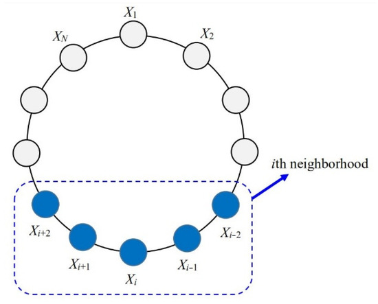 In order to enhance the local exploration ability of the population, the modified Nelder–Mead updating strategy is used to generate a new individual. For an individual Xi, the process of generating a new individual XNM is as follows. Firstly, the individuals are assumed to be organized on a ring topology in connection with their indices. The ith neighborhood includes n + 1 individuals, which is illustrated in Figure 3.