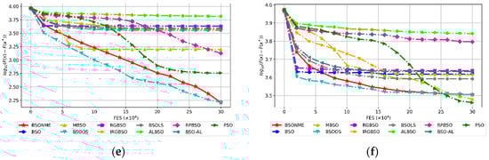 Figure 1a shows that MBSO performs better than BSO, BSO-OS, and IRGBSO. It indicates that the population generation strategy proposed in MBSO is effective. Figure 1b,c show that BSO-OS performs better than BSO, MBSO and IRGBSO. It can be concluded that effective grouping method can improve the performance of the algorithm. Figure 1d shows that IRGBSO performs better than BSO, MBSO, and BSO-OS. It can be seen that the re-initialization strategy is effective for some optimization problems. Although MBSO, BSO-OS, and IRGBSO perform better than BSO on some optimization problems, it can be seen from Figure 1 that the convergence curves of these algorithms are close to those of BSO algorithm. Therefore, it is necessary to design more effective strategies to improve the performance of the algorithm.