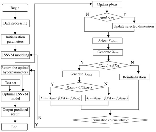 The flow chart of the proposed BSONME-LSSVM model is shown in Figure 12. The BSONME-LSSVM model finds the optimal hyperparameters through data preprocessing, initialization parameters and parameter optimization. Then, the LSSVM model is established with the optimal parameters, and the BSONME-LSSVM model is used to predict engineering problems.