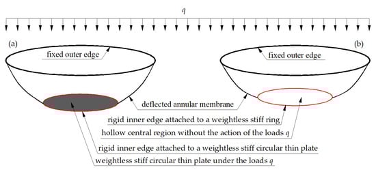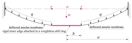 Sun et al. [31], for the first time, proposed a new type of annular membrane structure, a hollow annular membrane structure, different from the Alekseev-type annular membrane structure [28]. The main difference between the Alekseev-type [28] and Sun-type [31] annular membrane structures is that the central region of the annular membranes is filled with a flat, concentric and circular stiff thin plate in the Alekseev-type annular membrane structure, as shown in Figure 1a, and is hollow in the Sun-type annular membrane structure, as shown in Figure 1b. If the Alekseev- and Sun-type annular membrane structures have the same annular membranes and bear the same uniformly distributed transverse load, this difference in central regions may cause the elastic response of the annular membranes to differ greatly, resulting in a large difference in the ratio of the maximum deflection to the outer radius of the annular membranes, especially when the ratio of the inner radius to the outer radius of the annular membranes is relatively large. In the Alekseev-type annular membrane structure, the annular membrane, in addition to being directly subjected to the uniformly distributed transverse load q, is acted on at its rigid inner edge by the flat, concentric and circular stiff thin plate that is also under the action of the uniformly distributed transverse load q, while in the Sun-type annular membrane structure, the annular membrane is only directly subjected to the uniformly distributed transverse load q; see Figure 1. Therefore, under the same uniformly distributed transverse load q, the bigger the inner radius–outer radius ratio is, the bigger the contribution of the central regions to the elastic response is, the bigger the difference in elastic responses is, and the bigger the difference in the ratio of the maximum deflection to the outer radius of the annular membranes is. This is why Lian et al. [30] gave the closed-form solution of the Alekseev-type annular membrane structure under uniformly distributed transverse load, while Sun et al. [31] still need to analytically solve the problem of axisymmetric deformation of the hollow annular membrane structure loaded transversely and uniformly.