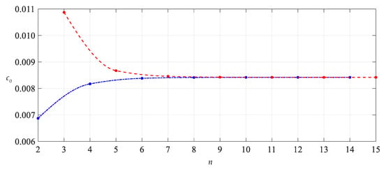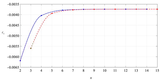 After expressing di (i = 1, 2, 3, …) and ci (i = 2, 3, 4, …) in the polynomials with regard to c0 and c1 (see Appendixe A and Appendixe B), with a given value of the parameter n in Equations (36), (37) and (38), the undetermined constants c0 and c1 can be determined by Equations (36) and (37), and with the known c0 and c1, the value of d0 can be further determined by Equation (38). We numerically calculated the values of the undetermined constants c0, c1 and d0 from n = 2. The results of numerical values of c0, c1 and d0 are listed in Table 1. The convergence trends of c0, c1 and d0 with n are shown in Figure 4, Figure 5 and Figure 6, where the connection lines of data points indicated by a dash-dotted line show the convergence trend of even terms (n = 2, 4, 6…) and those indicated by a dashed line show the convergence trend of odd terms (n = 3, 5, 7…). Of course, we can also make no distinction between odd and even terms to give an oscillation convergence trend, as shown in Figure 7, Figure 8, Figure 9 and Figure 10. However, sometimes it is very useful to distinguish between odd and even terms, as it can help to find the data points (invalid roots) that make connection lines not smooth. The smoothness can be used to judge the effective roots of higher-order equations of c0, c1 and d0, such as Equations (36)–(38).