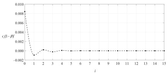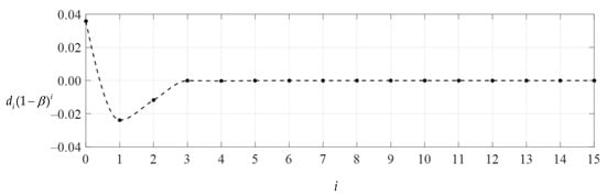 Therefore, with the known c0 and c1, the values of di (i = 1, 2, 3, …) can be determined by using the expressions in Appendix B, and with the known di values (i = 1, 2, 3, …), the value of d0 can be determined from Equation (35). Thus, the expression of W can also be determined.