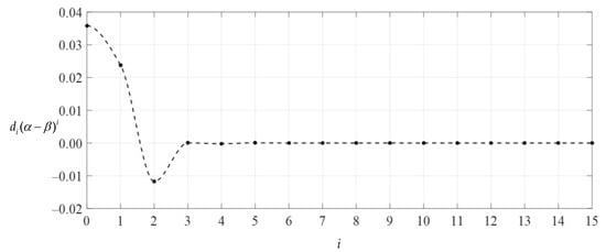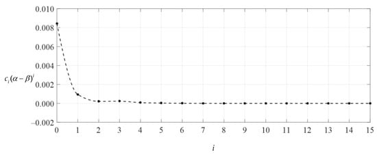 Obviously, if the special solutions of stress and deflection converge at both ends of the closed interval of the independent variable, i.e., at x = 1/2 (r = 10 mm) and at x = 1 (r = 20 mm), then they converge throughout the closed interval [1/2, 1]. Table 2 and Table 3 show the numerical values of stress and deflection of ci(1 − β)i, ci(α − β)i, di(1 − β)i and di(α − β)i, which were calculated by using Equations (31) and (32), where Q = 0.00382653, α = 1/2, β = (1 + α)/2 = 3/4, and the undetermined constants c0, c1 and d0 take the values 0.00841875, −0.00373713 and 0.03584094, respectively (i.e., the values at n = 15 in Table 1). Figure 7, Figure 8, Figure 9 and Figure 10 show the variations in di(α − β)i, di(1 − β)i, ci(α − β)i and ci(1 − β)I with i, indicating that the special solutions of stress and deflection converge very well at x = 1/2 and x = 1 and therefore converge throughout the closed interval [1/2, 1]. Moreover, it can be seen from Figure 7 and Figure 8 that when i is equal to about 5 or 6, the data sequences for ci(1 − β)i and ci(α − β)i show very good convergence, indicating that the infinite power series Equation (31) may be truncated to the sixth terms when used to express the stress special solution of the numerical example considered. However, it can also be seen from Figure 9 and Figure 10 that when i is equal to about 4 or 5, the data sequences for di(1 − β)i and di(α − β)i show very good convergence, indicating that the infinite power series Equation (32) may be truncated to the fifth terms when used to express the deflection special solution of the numerical example considered. Thus, drawing Figure 7, Figure 8, Figure 9 and Figure 10 is very important for the proper use of the power series solutions.