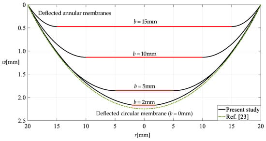 Figure 11 shows that the deflection profiles of the annular membranes gradually approach the deflection profile of the circular membrane as the inner radius b of the annular membranes gradually decreases from 15 mm to 2 mm, where the annular and circular membranes have the same Young’s modulus of elasticity E = 7.84 MPa, Poisson’s ratio v = 0.47, thickness h = 0.2 mm and outer radius a = 20 mm and are subjected to the same load q = 0.0005 MPa. The deflection profiles were calculated for the annular membranes using the closed-form solution given in Section 2 (“Present study” in Figure 11) and for the circular membrane using the closed-form solution presented in [23] (“Ref. [23]” in Figure 11). Therefore, it can be concluded from Figure 11 that the closed-form solution given in Section 2 is reliable to a certain extent.