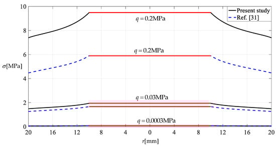 Figure 12 and Figure 13 show the variation in the deflection and stress of an annular membrane with uniformly distributed transverse load q, where the annular membrane has Poisson’s ratio v = 0.47, Young’s modulus of elasticity E = 7.84 MPa, outer radius a = 20 mm, inner radius b = 10 mm and thickness h = 0.2 mm and is subjected to loads q = 0.0003 MPa, 0.03 MPa and 0.02 MPa. “Present study” refers to the closed-form solution given in Section 2, and “Ref. [31]” refers to the closed-form solution given in [31]. The difference between this study and the previous study [31] mainly lies in the out-of-plane equilibrium equations, that is, the difference between Equation (3) in this paper and Equation (3) in [31]. The out-of-plane equilibrium equation in [31] used the assumption of a small deflection–outer radius ratio or small rotation angle of the membrane, while the new out-of-plane equilibrium equation in this study makes no such assumption.