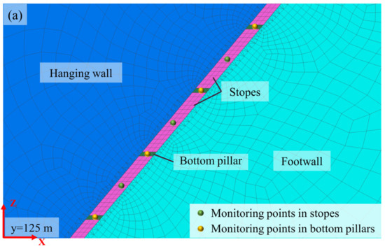 To obtain the variation law of the deformation and stress of backfilled stopes with the mining, 33 stress monitoring points are set to monitor the stress state of the barrier pillars, bottom pillars, and backfilled stopes, as shown in Figure 3. Since the structure and stress state of the model are symmetrical along the y-axis, the simulation program only records the stress of the middle stope in each layer.