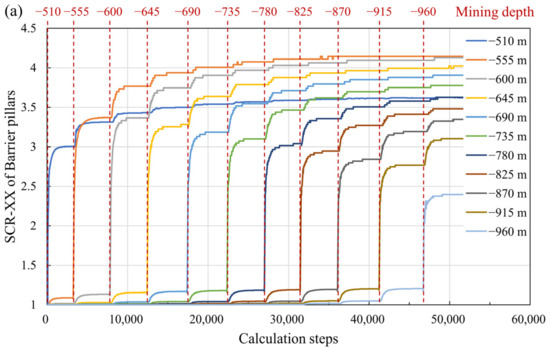 Figure 11 is a graph showing the variation of SCR-XX with the depth of the stope along the direction of maximum principal stress for all stopes. The curves of different colors represent different mining depths. Figure 11a,b are the SCR-XX of barrier pillars and bottom pillars. It can be seen from Figure 11 that the SCR curve of barrier pillars and bottom pillars shows a downward trend as a whole. After mining, the SCR of barrier pillars and bottom pillars in deeper stopes is smaller than that of the shallower stopes. Because all stopes in the model have the same size, the differences in SCR between pillars in different stopes is caused by the depth.