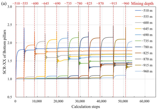 Figure 10 is the variation of the SCR of the bottom pillar at each depth. Figure 10a–c display SCR-XX, SCR-YY, and SCR-ZZ of the bottom pillars respectively.