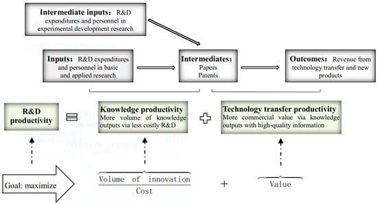 Here, the conceptual framework for R&D productivity was developed from the theory of innovation value chain, emphasizing the interdependence of inputs (such as R&D investments), intermediates (such as new patent authorization), and outputs (such as revenue from technology transfer) [26]. It constructs a two-stage R&D process where innovators can produce knowledge and technology, so as to transform them into benefits [43]. Figure 1 outlines the key two-stage conceptual framework and the aims related to knowledge productivity and technology transfer productivity. Note that these two-stages are relational since they are connected by intermediates. This means that intermediates have a dual role, that is, the output in the stage of knowledge production and the input in the stage of technology transfer. Effective innovation policies need to take these two sub-stages into account.