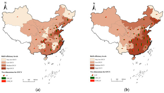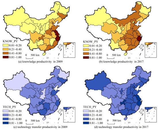 Spatial distributions of R&D productivity in (a) 2009 and (b) 2017 in China. KNOW_PY and TECH_PY are knowledge productivity and technology transfer productivity, respectively.