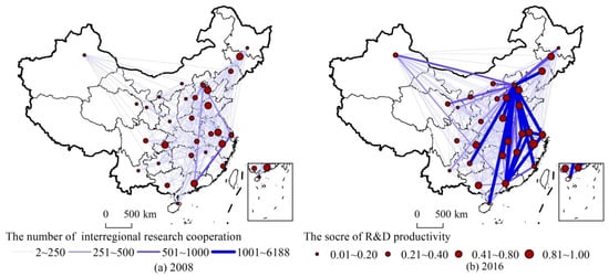 Spatial patterns of interregional collaboration and R&D productivity in 2008 and 2016 in China.