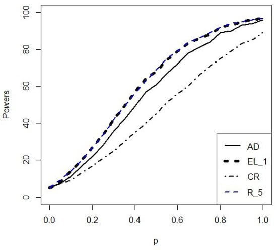 The choice of was made since it is the point where the powers for most of the alternative distributions start to stabilize and reach a plateau. The choice for is due to the fact that it is the point where the powers for most of the alternative distributions reach their maximum value.