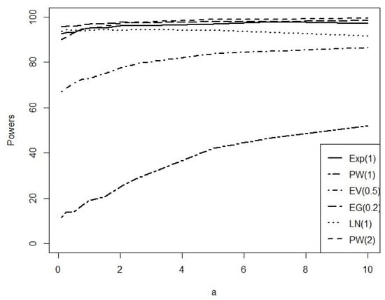 Here, we test for the Rayleigh distribution by testing for exponentiality of the transformed data (using the well known property that the square of a Rayleigh distributed random variable follows an exponential distribution). The estimated powers of and are functions of a tuning parameter, a. For both and we report the results for .