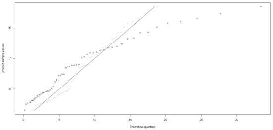 As noted in Section 1, the Rayleigh distribution found various applications in the fields of survival analysis and reliability theory. In this section we demonstrate the use of the tests specifically developed for the Rayleigh distribution by applying them to a real-world survival data set: the COVID-19 data set of Italy given in Table 8—for a discussion on the data set, see [30]. The data set displays the COVID-19 mortality rates recorded for 59 days in Italy from 27 February 2020 to 27 April 2020. Ref. [30] discussed and analysed the use of an extended three parameter Rayleigh distribution to model the data. They concluded that the newly extended Rayleigh distribution is a good fit to the data. We, however, will investigate the goodness-of-fit of the traditional one parameter Rayleigh distribution as well as that of the exponential distribution. Figure 3 represents the probability plots of both the Rayleigh (grey dots) and exponential (black dots) distribution fitted to the data, where and in the case of the exponential distribution.