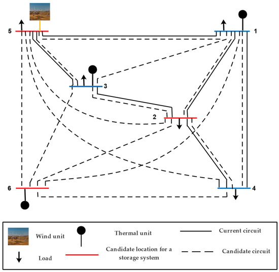 The Garver network is a benchmark system and is widely used for investigating the efficiency of TEP’s models. It has six buses, three-generation units, and five load buses [22], [32]. Bus 5 was suggested as a candidate position for new wind units, and buses 2, 5, and 6 were suggested for new ESSs. The network’s initial configuration is shown in Figure 2. New candidate routes are presented in dash lines.