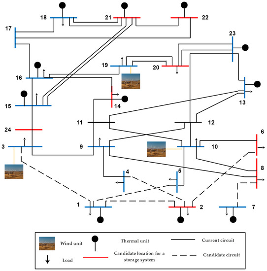 The IEEE-24 bus system has 24 buses, eleven generation units, and seventeen load buses. Some modifications to the system were made in [32] to make congestions. The candidate locations for new wind units were buses 3, 10, and 19. While the candidate locations for ESSs were buses 2, 6, 8, 14, 20, 21, 22, and 24. The initial configuration of the system is depicted in Figure 3.