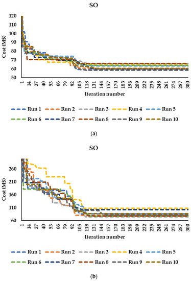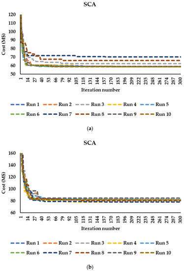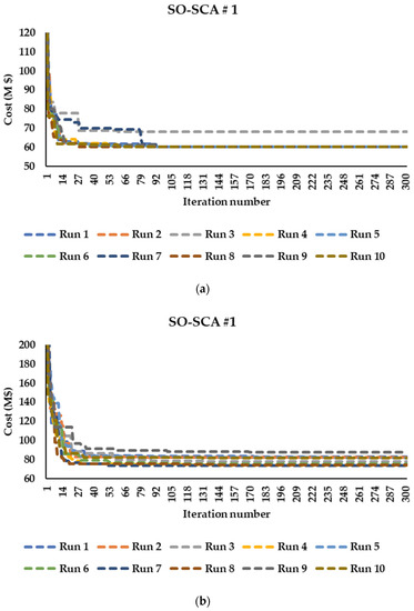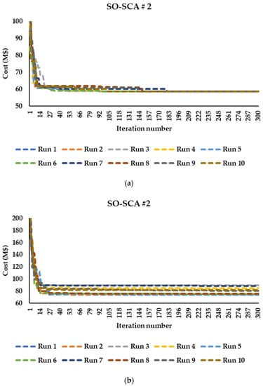 Figure 4, Figure 5, Figure 6 and Figure 7 show the convergence curves of the hybrid algorithm using the two approaches, SO and SCA, over ten runs. Noteworthy, all the simulations in this section were carried out without embedding L1 and L2 securities. The population size was 30 for SO-SCA #2 and 40 for SO-SCA #1, SO, and SCA. It is shown that the series approach effectively solved the Garver network in terms of standard deviation and quality of solutions compared to the parallel approach, as shown in Table 2. For the IEEE 24-bus system, SO-SCA #1 gave a lower standard deviation than SO-SCA #2, as illustrated in Table 3. Regarding SO and SCA, SCA achieved better performance than SO for the 24-bus system, but SO was superior to SCA in solving the Garver network.