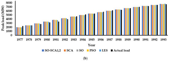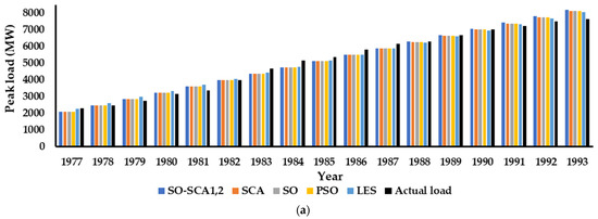 The performance of SO-SCA-the based load forecasting technique was compared with PSO-, SCA-, SO, and least error squares (LES) estimation-based methods. The estimated parameters are given in Table 4 and Table 5. The predicted load using all algorithms is depicted in Figure 8.