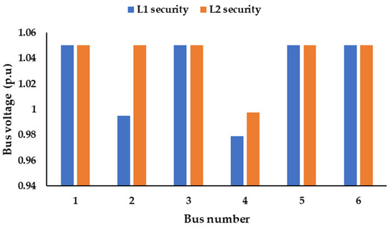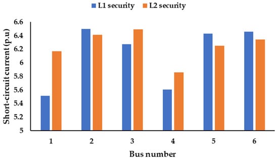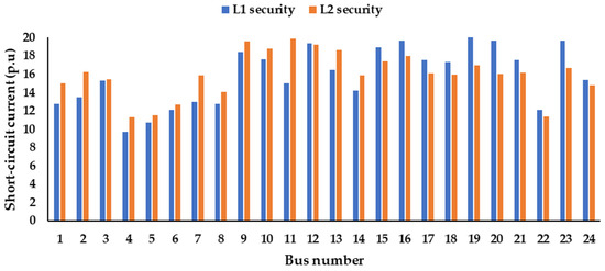 According to Table 7, new circuits were installed at the routes 1-2, 1-3, 2-4, 2-6, 7-2, 7-5, and 7-8 to guarantee L1 and L2 securities. It is worth emphasizing that the reliance on the location of new circuits was not enough to achieve the short circuit-current constraints. The use of FCLs was necessary. The short-circuit current at scenario number 24, as an example, is depicted in Figure 11. The results indicated that the planning model was able to maintain the buses’ voltage within their limits. They did not violate the upper and lower bounds (0.9–1.1 p.u), as shown in Figure 12.