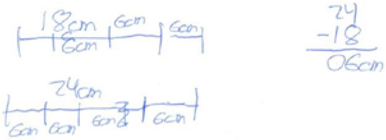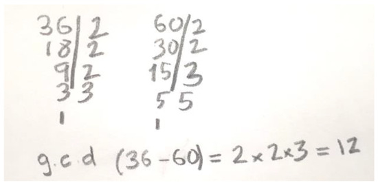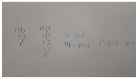 As shown in Table 3, a considerable portion (16.1%) of the students tended to apply l.c.m. instead of g.c.d. methods, especially when the g.c.d. needs an additional operation (about 20% of the cases). In Figure 1, an example of this type of action is presented in the GCDDL problem: “For one of the camp tests, a scout group needs to prepare equal length ribbons as long as possible from two strings, one of 15 cm and another of 24 cm, how many ribbons can they get without leftover strings?” This difficulty was later a subject of the qualitative study, to investigate its causes.