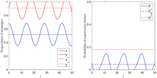 The shocking “Sanlu milk powder” incident in 2008 is a typical food safety incident, which aroused wide concern from society and had a significant negative impact. The State Council of PRC launched a national security incident level I (the highest level) response mechanism to deal with the “Sanlu milk powder” incident. Therefore, in order to analyze the probability of food safety supervision failure and the determining factors in the periodical fluctuation, we take the “Sanlu milk powder” incident as an example to conduct a numerical simulation. In this major food safety incident, hundreds of thousands of infants and children were sick and four infants were even killed after drinking milk powder with the illegal addition of melamine. Sanlu Group was fined more than CNY 49.37 million and had to pay for the treatment of the victims. Moreover, this food incident was a huge blow to China’s dairy exports. Since significant amounts of real data are not available and some parameters cannot be quantified directly, the values of some of the parameters in this paper are roughly estimated according to the actual situation. Assume that the punishment is about CNY 85 million, including fines, compensation, and shutdown losses. If Sanlu Group had conducted rectification in time and invested in food safety when the problems were discovered, it would have avoided losses and fines and would even have obtained a corresponding investment income. The food safety input is assumed to be CNY 20 million and the corresponding investment income is about CNY 10 million. For the government, the cost of conducting strict supervision is assumed to be CNY 20 million, while million CNY if food enterprises produce safe food. The Sanlu milk powder incident not only had a negative impact on the image and reputation of the regulator, but also sapped people’s trust in domestic milk powder and seriously affected China’s milk powder exports. Therefore, is assumed to be CNY 90 million. The above estimations of other parameters meet the following conditions: and . Otherwise, the supervision institution gives up on regulating completely because of the high inspection costs, or the food enterprise engages in illegal production due to the weak punishment. Therefore, the values of the relevant parameters are: , , , , , (unit: CNY million).