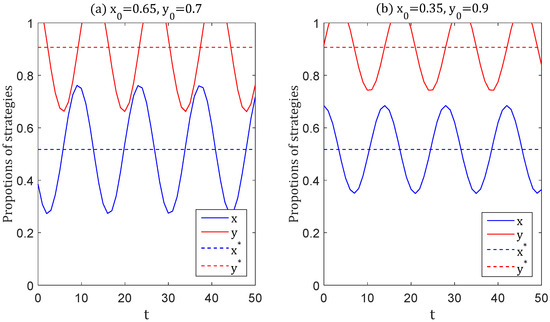 From the above, it is clear that the probability of supervision failure is affected by the amplitude and the mixed equilibrium point . According to the equation , the amplitude is affected by the initial state and of the food safety supervision game. According to Equation (7), the mixed equilibrium point is affected by the parameters related to the payoffs of both players in the evolutionary game. In the following sections, we use numerical simulations to further analyze the probability of food safety supervision failure and the determining factors in the periodical fluctuation.