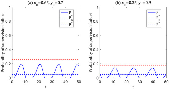 Effects of different initial states on the probability of supervision failure. (a) The periodical fluctuation in the probability of supervision failure in initial state , (b) The periodical fluctuation in the probability of supervision failure in initial state . The upper limit of the probability of supervision failure is also affected by the initial states.