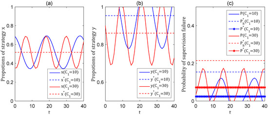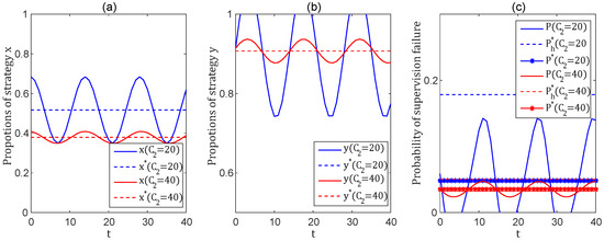directly affects the payoff of food enterprises. To investigate the effects of the legal production cost in detail, the simulations were conducted with different values of and . The results in Figure 5 show that the equilibrium proportion of the strict supervision strategy decreases to 0.3793 and the equilibrium proportion of the supervision failure probability decreases to 0.0353, with the legal production cost increasing to 40. We can infer that supervision failure probability decreases with the increasing . In other words, the occurrence of food safety incidents decreases with the increase in the legal production cost . Consider that food standards are lax and food enterprises can pay low costs to produce food legally. With the premise that the supervision strength remains the same, most food enterprises, especially small ones, are more likely to adopt legal production strategies to avoid punishment. As a result, the qualification rate of food enterprises becomes higher, which in turn causes supervision institutions to relax their supervision. With the relaxation of supervision, food enterprises are inclined to take opportunities to save on costs and adopt illegal production strategies. Therefore, the equilibrium proportion of legal production strategies remains the same. However, food produced by qualified enterprises is not necessarily safe compared with that produced to high standards. Thus, low legal production costs lead to high rates of supervision failure and more food safety incidents indirectly. By contrast, with high food standards, food enterprises have to pay more to engage in legal production. In this case, many food enterprises, especially small ones, are more likely to take opportunities to save on costs. The low qualification rate instead urges supervision institutions to adopt strict supervision strategies. These results indicate that improving food standards properly can eliminate some “small-workshop” food enterprises, thus reducing the difficulties involved in food safety supervision and helps to lower the probability of supervision failure probability and prevent food safety incidents.
