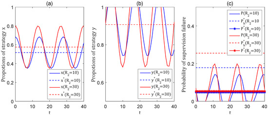 A food enterprise can obtain added benefits by engaging in illegal production when the supervision institution implements a loose supervision strategy. To investigate the effects of added benefits in detail, the simulations were conducted with different values of and , while the other parameters remained unchanged. Intuitively, the high benefit of can tempt food enterprises to adulterate their food; the equilibrium position of legal production should increase with the higher . However, the simulation results contradicted this intuitive judgment. The results in Figure 8 show that the equilibrium position of loose supervision strategies decreases to 0.3846, but the equilibrium position of legal production strategies remains the same. The reason for this is that when the food enterprise tries to engage in illegal production with the temptation of high added benefits, the supervision institution strengthens its supervision. Consequently, the equilibrium point of supervision failure probability decreases, which is consistent with the results in Figure 8c, in which the decreases to 0.0358 with the higher . Furthermore, with the higher , the amplitude also becomes smaller. The results in Figure 8 indicate that the supervision institution can properly overestimate the added benefits of illegal production to circumvent the high rate of food safety incidents.