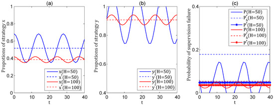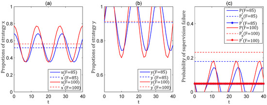 Enterprises engaged in illegal production have to pay a punishment under strict supervision. The punishment includes penalties, stopping production for consolidation, closure, compensation for victims, etc. To investigate the effects of punishment on the periodical fluctuation in the supervision game, the simulations were conducted with different values of and , while the other parameters remained unchanged. The results in Figure 7 show that the equilibrium proportions of loose supervision strategies and legal production strategies increase to and with the higher punishment . Furthermore, the equilibrium supervision failure probability increases to 0.0489 and the amplitude increases to 0.2129 with the punishment increase to 100. According to the results, the severe punishment indeed forces food enterprises to engage in legal production, but the punitive measures are not particularly effective at reducing the probability of supervision failure. The reason for this is that severe punishment brings the supervision institution an added income, which may lead the supervision institution to rely on penalties excessively. Therefore, from the perspective of supervision failure and amplitude, the supervision institution cannot only rely on punitive measures to regulate food enterprises.