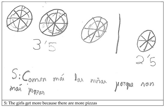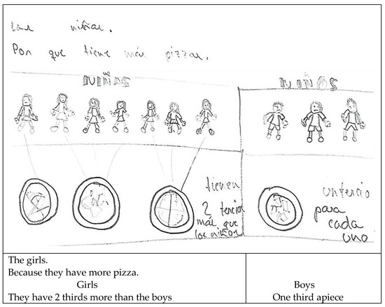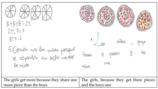 As the examples illustrated above show, the students used a number of representation systems to find the answer to the task. A total of 80% of the participants used more than one system, with graphic and verbal representation prevailing. The graphic system was used by 85 students, most of whom drew circles to represent the pizzas, although some represented the number of girls and boys involved in each case (Figure 5). Verbal representation was used by 86 students to answer the question posed and explain their reasoning. Symbolic-numerical representation was present in 43 exercises, mostly in the form of natural numbers.