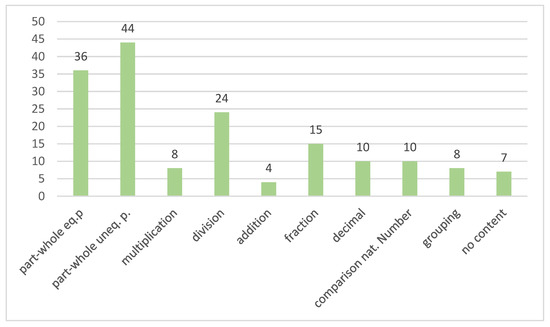 The students used different mathematical contents to solve the task posed. The frequency of use of each content graphed in Figure 7 indicates that the part-whole relationship was a key component in the task posed, as it appeared in 80 of the 105 solutions. That notwithstanding, 44 of the students exhibited difficulties in partitioning the units, failing to bear in mind that the parts were to be equal, as observed in the exercise depicted in Figure 6.
