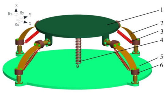 Schematic of the platform: (1) top plate; (2) leaf spring; (3) suspension spring; (4) central spring; (5) base plate; (6) spherical hinge.