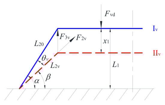 The static loading status of the platform in vertical displacement is shown in Figure 5. There is the downward displacement x1 in the top plate under the vertical force Fvd from the initial state Iv to the second state IIv. Accordingly, the length of suspension spring decreases from L20 to L2v, and the slant angle changes from α to β, and the leaf spring has a rotation angle of θv. Besides, the central spring has the initial stretch length of L1. In the state IIv, the central spring is still stretched, whereas the suspension spring and leaf spring are both compressed. Hence, the positive stiffness is provided by the leaf spring and suspension spring, and the negative stiffness is provided by central spring.