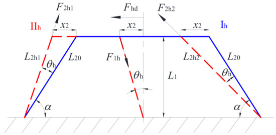 The force condition in horizontal displacement analysis is shown in Figure 6. The top plate has a leftward displacement x2 under the horizontal force Fhd from the initial state Ih to the second state IIh. Therefore, the length of the left and right springs will change inconsistently. The length of suspension spring decreases from L20 to L2h1 in the left, and increases from L20 to L2h2 in the right, and both sides of the leaf springs have a same rotation angle of θh. Moreover, the central spring also rotates θh from its initial position. In the state IIv, the central spring is stretched, whereas the suspension springs are both compressed. Although the leaf springs are also compressed, the horizontal force is offset by the interaction of the left and right leaf springs. Hence, the positive stiffness is provided by leaf spring and left suspension spring, and the negative stiffness is provided by right suspension spring.