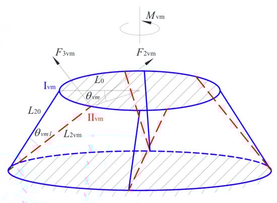The force condition in vertical rotation analysis is shown in Figure 7. The top plate has a contrarotation under the torque Mvm around the vertical axis, and hence, there is the rotation angle θvm from the initial state Ivm to the second state IIvm. Moreover, the length of suspension spring increases from L20 to L2vm, and the slant angle changes θvm horizontally and circumferentially, and the leaf spring has a rotation angle of θvm1. Besides, there is no change in the central spring. In the state IIv, the suspension spring and leaf spring are both compressed, whereas the positive stiffness is provided by the leaf spring, and the negative stiffness is provided by the suspension spring because the direction of torque on the two springs is different.