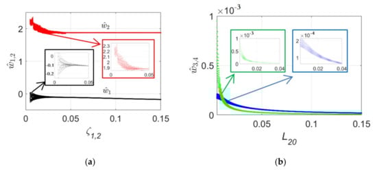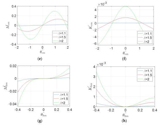 According to the relations of rotation angles and dimensions in Figure 6, there are , , . By introducing the non-dimensional parameters , , , , the non-dimensional form of Equation (10) can be expressed as Equation (11):