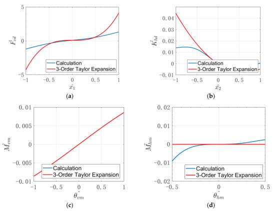 It is indicated in Figure 10 that the variation tendency of , , , and can be approximated using the third-order Taylor series within a small deviation near the static equilibrium position. The maximum difference is no more than 3.5%, and is near to zero in the vertical rotation.