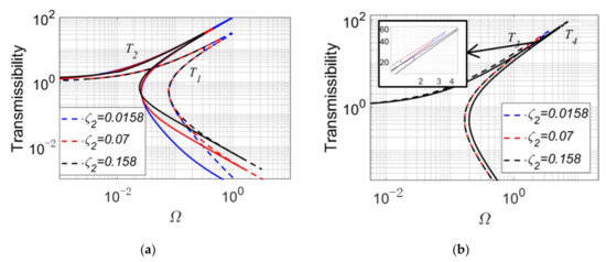 In addition, in order to verify the frequency jump phenomenon of the QZS vibration isolation system, the reverse frequency sweep experiment was carried out on the premise of keeping the experimental settings unchanged. The forward and reverse displacement transmissibility are compared in Figure 23.