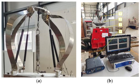 Six degrees of freedom quasi-zero stiffness vibration isolation platform and its test setup: (a) the experiment platform; (b) test on site ((1) 6-DOF QZS platform; (2) accelerometer; (3) vibrator; (4) acquisition instrument).