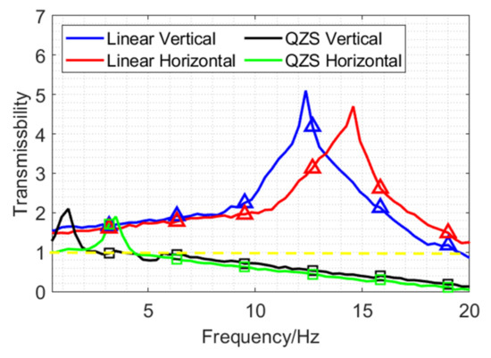 According to the platform parameters given in Table 1, the natural frequency of the platform can be calculated from Equation (27) as 20 Hz. In addition, combined with the theoretical calculation results of transmissibility in Figure 19 and Figure 20, it can be seen that the effective initial vibration isolation frequency of the platform is 0.1~0.2 times the natural frequency: about 2~4 Hz. Therefore, the above test results are basically in line with the expectation of theoretical calculation. At the same time, the vibration isolation frequency of vertical displacement is about 2 Hz smaller than that of horizontal displacement, about 0.1 times the natural frequency, which is also consistent with the characteristics of Figure 19 and Figure 20. This indicates that compared with the corresponding linear isolation platform, the QZS vibration isolation platform expands the vibration isolation range, reduces the initial vibration isolation frequency, and has a great possibility to achieve low-frequency vibration isolation, which is basically consistent with theoretical research.