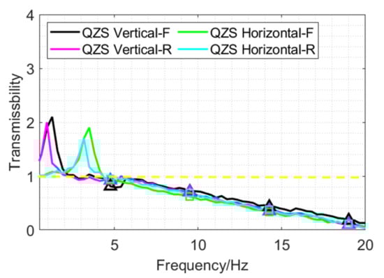 The vertical and horizontal displacement transmissibility obtained by the test is compared in Figure 22.