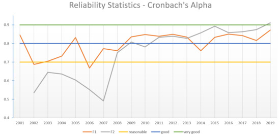 The EFCs’ indicators, which are combined in the second component, include very different subjects and are poorly interpretable when combined into a single factor. However, this behaviour is different over time. This is presented in Table 3 and discussed in the corresponding text. In Table 4, it can also be observed that in the beginning (first few years) some of these EFCs have MSAs less than 0.4, indicating that they are not very correlated with the others in the analysis. Reliability statistics—Cronbach’s alpha, for two factors (Table 5) also illustrates reliability values that are larger in the last few years. Thus, effectively, this second factor, although to present acceptable reliability, is not evidence of their consistency in terms of real interpretation and constitution.