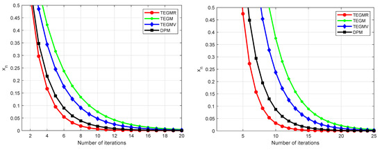 In this subsection, we provide some numerical examples to illustrate the behavior and performance of our Algorithm 3 (TEGMR) as well as comparing it with Algorithm (4) (DPM of Hieu et al. [18]), Algorithm 1 (TEGM of Thong and Hieu [5]) and Algorithm 2 (TEGMV of Thong and Hieu [5]).