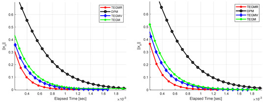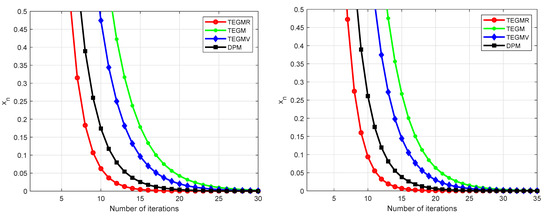 Let be given by for all , be given by , be given by for all . The feasible set C is given by The maximum number of iterations is 300 as the stopping criterion and the initial values are randomly generated by rand in MATLAB. Let us choose , , and . Figure 4 describe the numerical results, for Example 2 in and and , respectively.