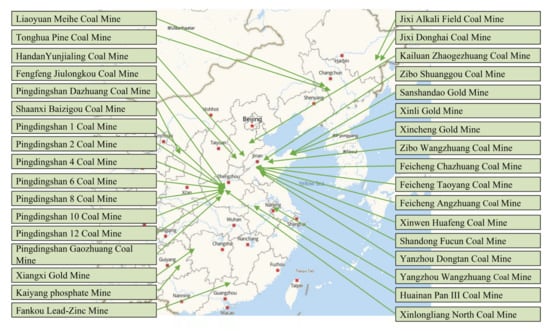 To establish a reliable predictive model, a total of 209 cases from 34 mines were collected [46,47,48,49,50]. The locations of these mines are shown in Figure 1. It can be seen that the types of these mines were different, and included coal mines, gold mines, phosphate mines, and lead–zinc mines. In addition, these mines were in different regions, which indicated that the collected dataset was complex to some extent.