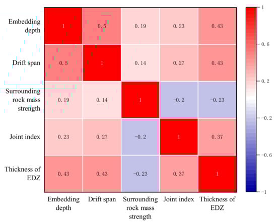 To quantitatively describe the correlation between indicators and the thickness of an EDZ, the Pearson correlation coefficient was calculated, as shown in Figure 3. In this figure, red represents a positive correlation, blue represents a negative correlation, and the depth of color indicates the strength of correlation. It can be seen that the thickness of an EDZ and these four indicators had different correlation degrees, which showed that these indicators were relatively independent. Therefore, these four indicators were used as the input variables.
