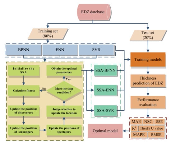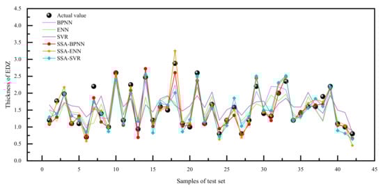 The goal of this study was to use SSA-BPNN, SSA-ENN, and SSA-SVR models to predict the thickness of an EDZ. Firstly, an EDZ database including 209 cases was established. Secondly, SSA-BPNN, SSA-ENN, and SSA-SVR models were proposed for the thickness prediction of an EDZ. Thirdly, seven indexes were used to evaluate the performance of each model. Finally, all models were compared and analyzed, and the best model was determined.