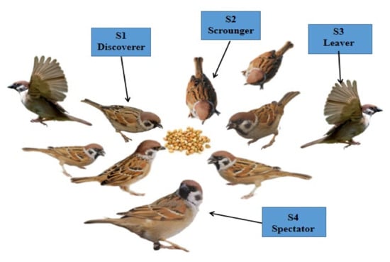 According to the original foraging principle of sparrow populations, a discoverer–scrounger model was established [54]. The interrelationships between individuals in the sparrow population are shown in Figure 5. Generally, the discoverer S1 is responsible for finding food and safe areas, while the scrounger S2 tracks the location of S1 to obtain food, and their roles are constantly changing [55,56]. S3 represents the sparrow at the edge of feeding area. It may leave the location and find another place because it is in the most dangerous position. S4 is responsible for detecting the safety of surrounding environment, and other sparrows also pay attention to S4 while eating.
